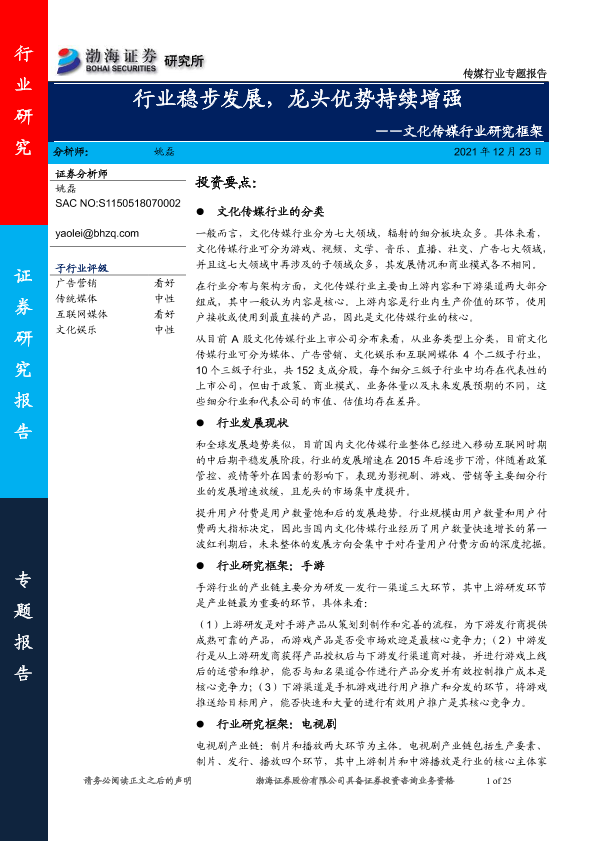 【渤海证券】【20211223】文化传媒行业研究框架:行业稳步发展,龙头优势持续增强-25页