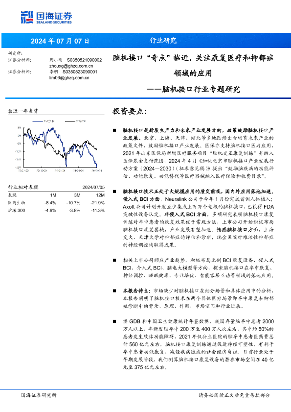 【国海证券】【20240707】脑机接口行业专题研究:脑机接口“奇点”临近,关注康复医疗和抑郁症领域的应用-22页