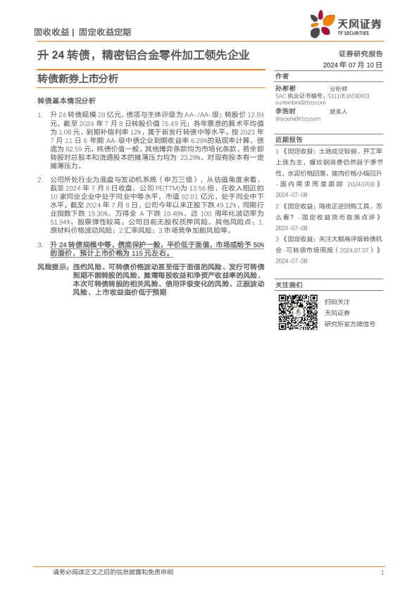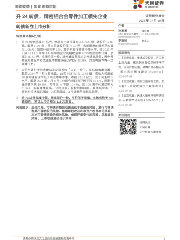 【天风证券】【20240710】转债新券上市分析:升24转债,精密铝合金零件加工领先企业-10页