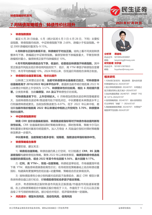 【民生证券】【20240708】转债策略研究系列:7月转债策略组合,转债性价比回升-19页