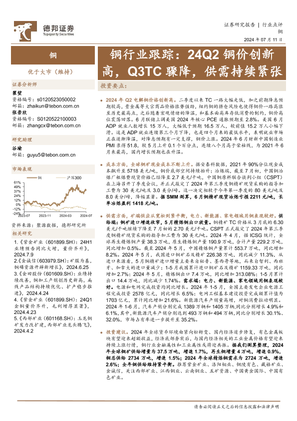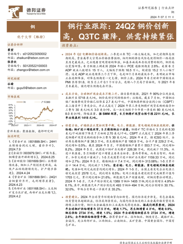 【德邦证券】【20240711】铜行业跟踪:24Q2铜价创新高,Q3TC骤降,供需持续紧张-13页
