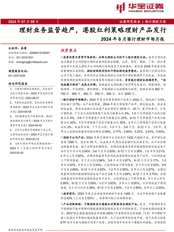 【华宝证券】【20240709】银行业2024年6月银行理财市场月报:理财业务监管趋严,港股红利策略理财产品发行-12页