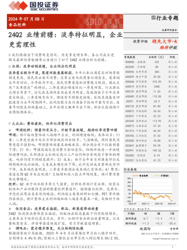 【国投证券】【20240708】食品饮料行业24Q2业绩前瞻:淡季特征明显,企业更需理性-11页