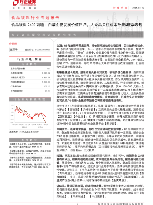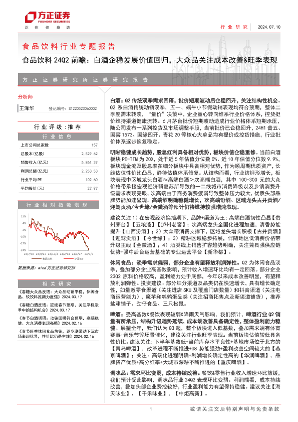 【方正证券】【20240710】食品饮料行业24Q2前瞻:白酒企稳发展价值回归,大众品关注成本改善&旺季表现-19页