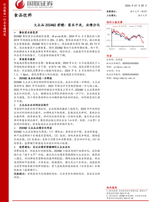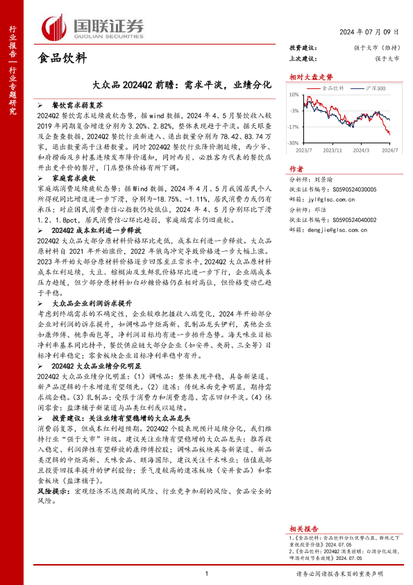 【国联证券】【20240709】食品饮料行业大众品2024Q2前瞻:需求平淡,业绩分化-11页