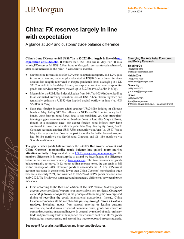 【J.P. Morgan】【20240707】中国外汇储备大致符合预期:国际收支与海关贸易平衡差异一瞥-9页