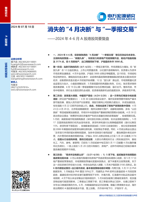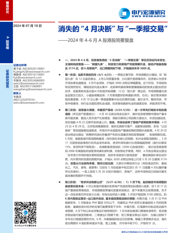 【申万宏源】【20240718】2024年4-6月A股港股简要复盘:消失的“4月决断”与“一季报交易”-10页