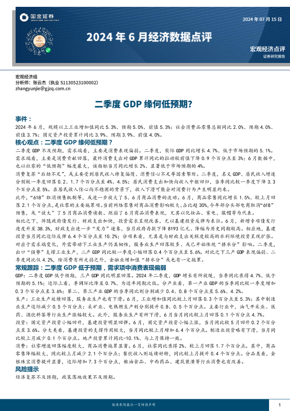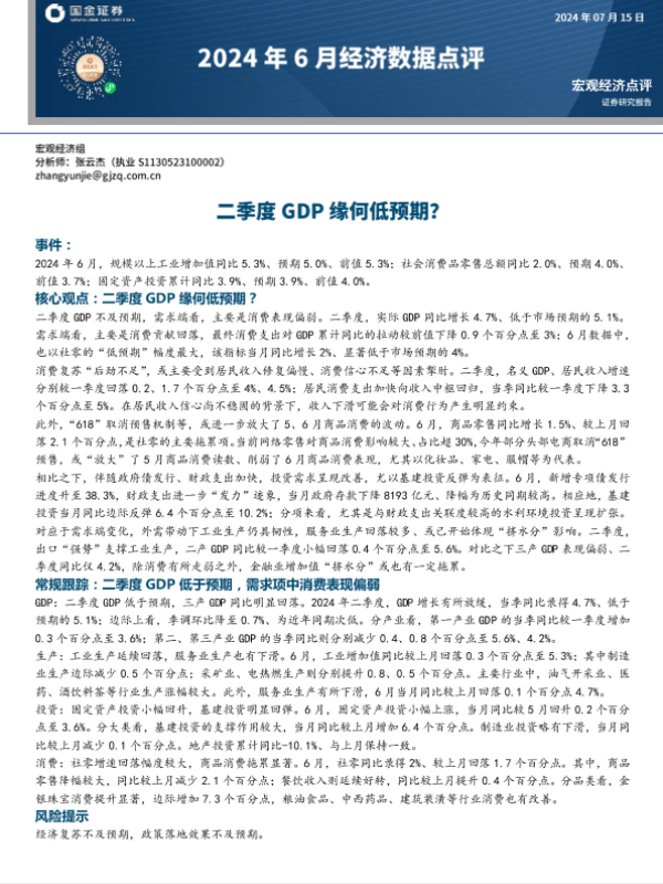 【国金证券】【20240715】2024年6月经济数据点评:二季度GDP缘何低预期?-13页