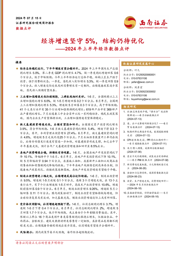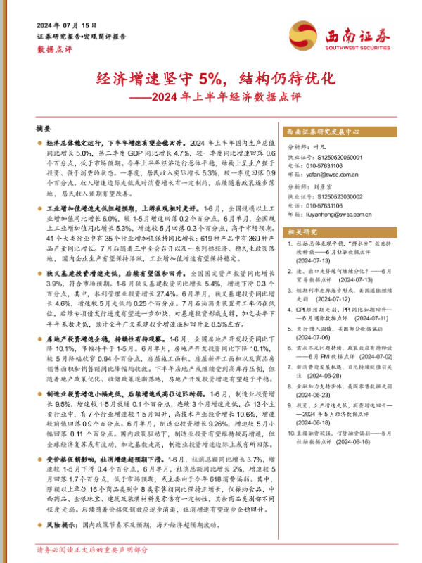 【西南证券】【20240715】2024年上半年经济数据点评:经济增速坚守5%,结构仍待优化-11页