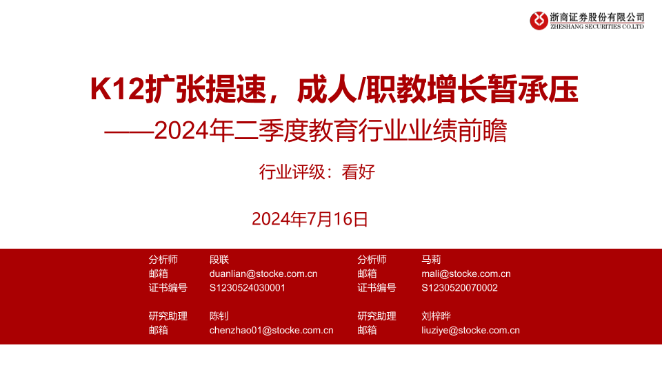 【浙商证券】【20240716】2024年二季度教育行业业绩前瞻:K12扩张提速,成人/职教增长暂承压-18页