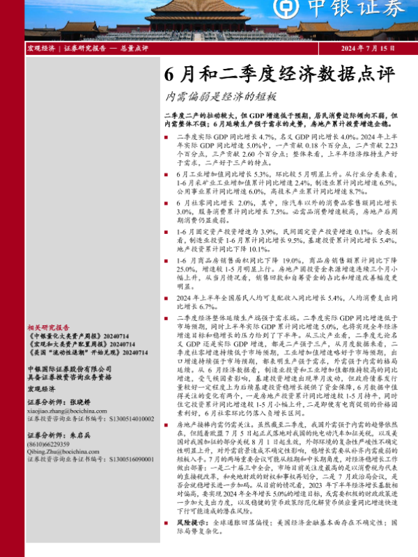 【中银证券】【20240715】6月和二季度经济数据点评:内需偏弱是经济的短板-11页