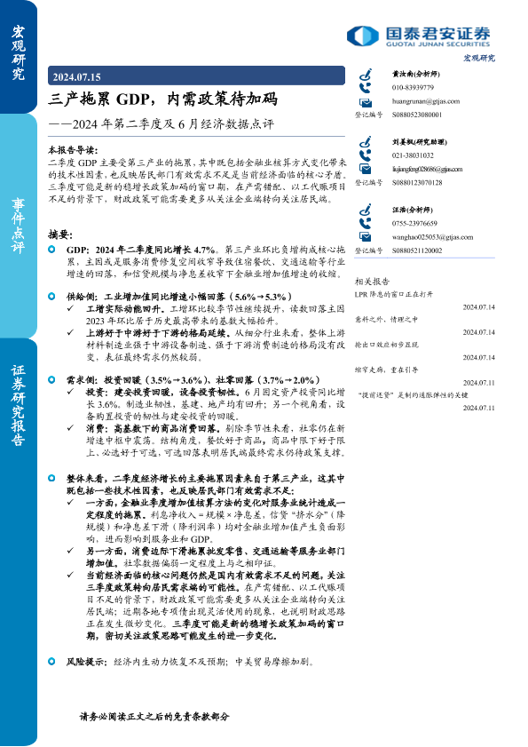 【国泰君安证券】【20240715】2024年第二季度及6月经济数据点评:三产拖累GDP,内需政策待加码-10页