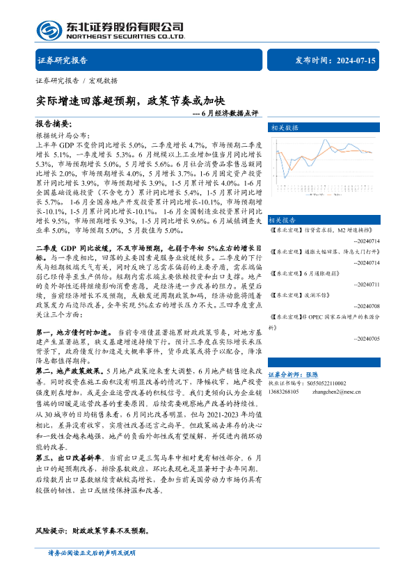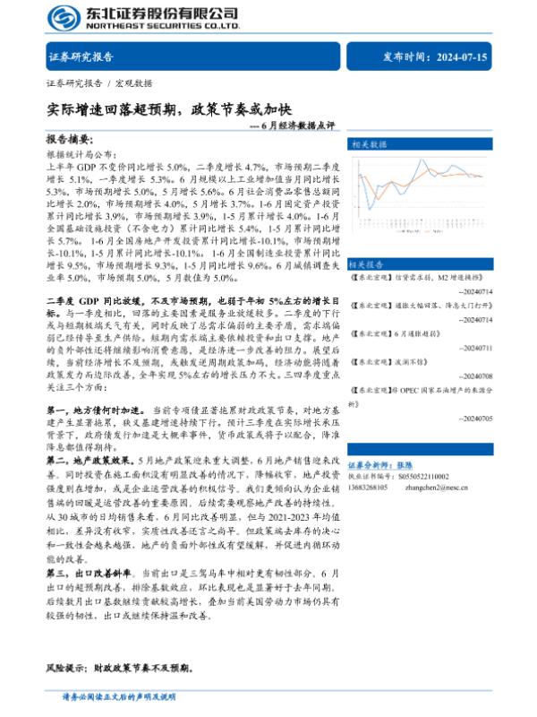 【东北证券】【20240715】6月经济数据点评:实际增速回落超预期,政策节奏或加快-13页
