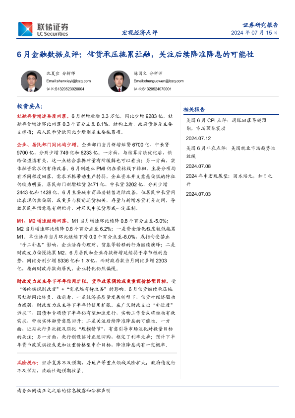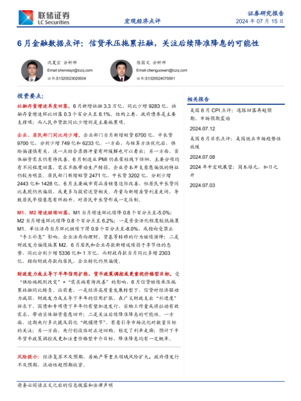 【联储证券】【20240715】6月金融数据点评:信贷承压拖累社融,关注后续降准降息的可能性-10页