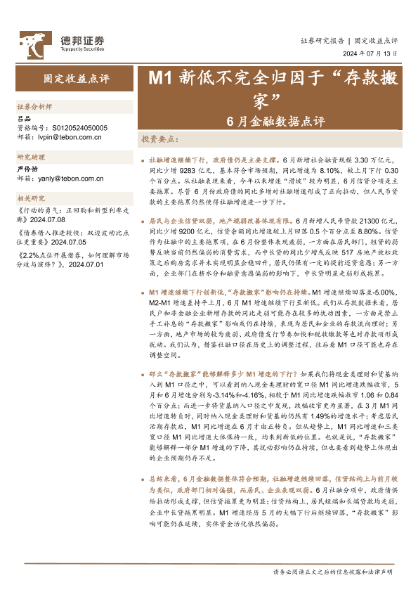 【德邦证券】【20240713】6月金融数据点评:M1新低不完全归因于“存款搬家”-11页