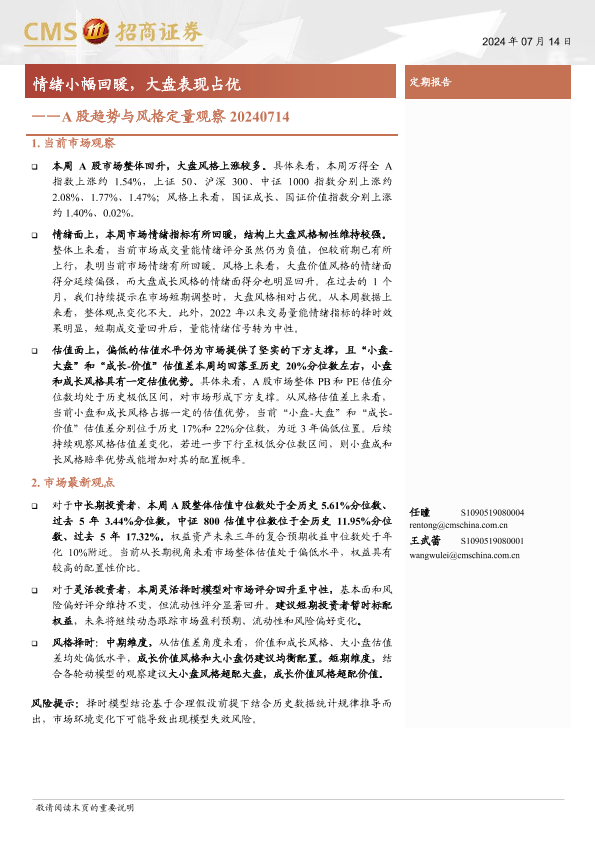 【海通证券】【20240714】A股趋势与风格定量观察:情绪小幅回暖,大盘表现占优-11页