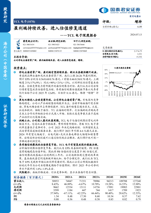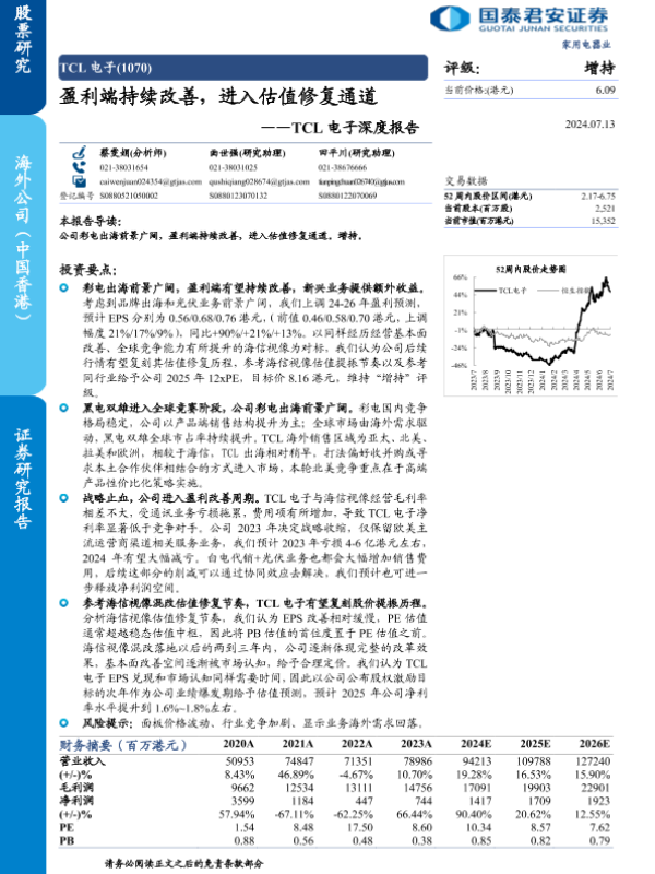 【国泰君安证券】【20240713】TCL电子(1070.HK)深度报告:盈利端持续改善,进入估值修复通道-35页