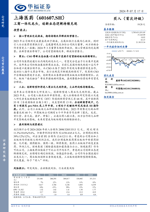 上海医药 业绩预测 创新业态 医药行业 工商一体化