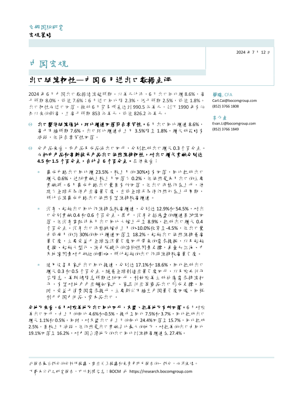 【交银国际】【20240712】中国宏观:中国6月进出口数据点评,出口延续韧性-10页