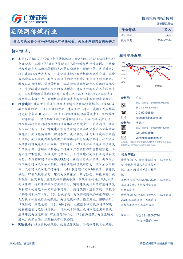 【广发证券】【20240714】互联网传媒行业:分众与美团将合作加强低线城市梯媒运营,关注暑期档内容供给拐点-22页