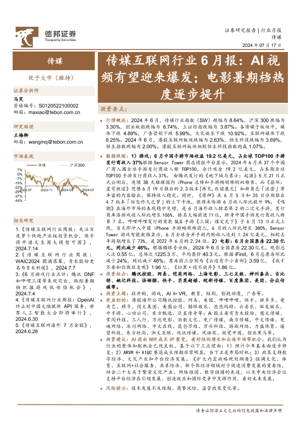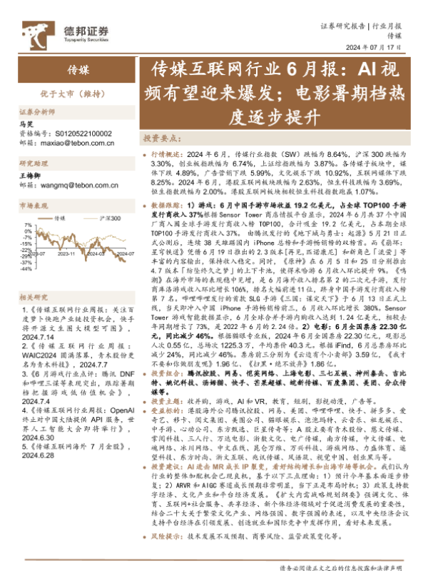 【德邦证券】【20240717】传媒互联网行业6月报:AI视频有望迎来爆发;电影暑期档热度逐步提升-13页