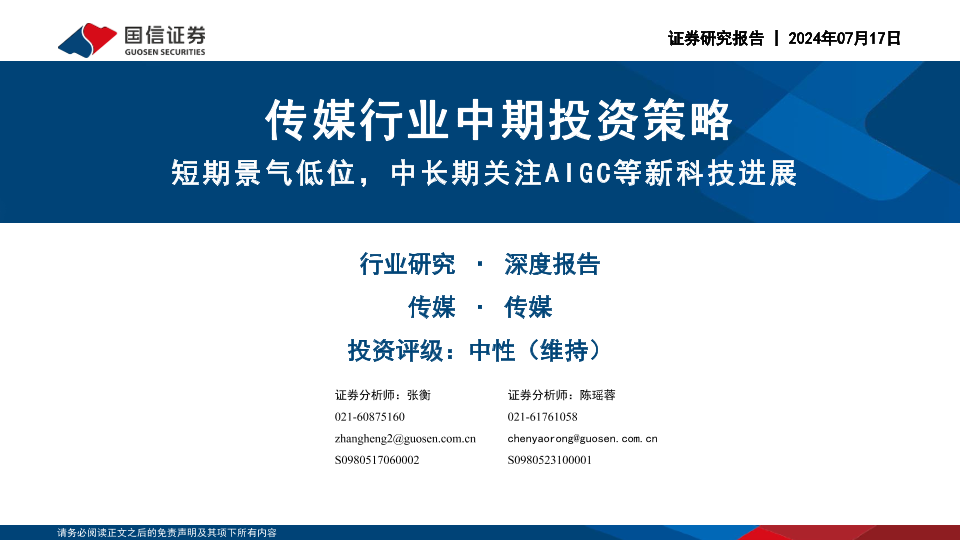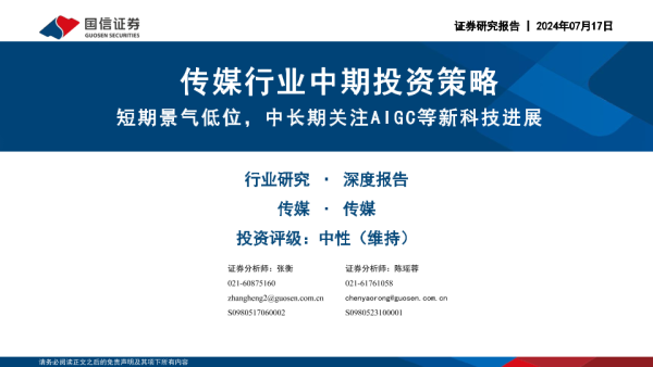 【国信证券】【20240717】传媒行业中期投资策略:短期景气低位,中长期关注AIGC等新科技进展-45页