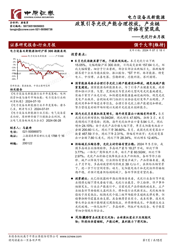 【中原证券】【20240718】光伏行业月报:政策引导光伏产能合理投放,产业链价格有望筑底-15页
