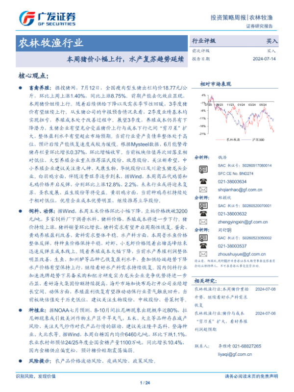 【广发证券】【20240714】农林牧渔行业:本周猪价小幅上行,水产复苏趋势延续-24页