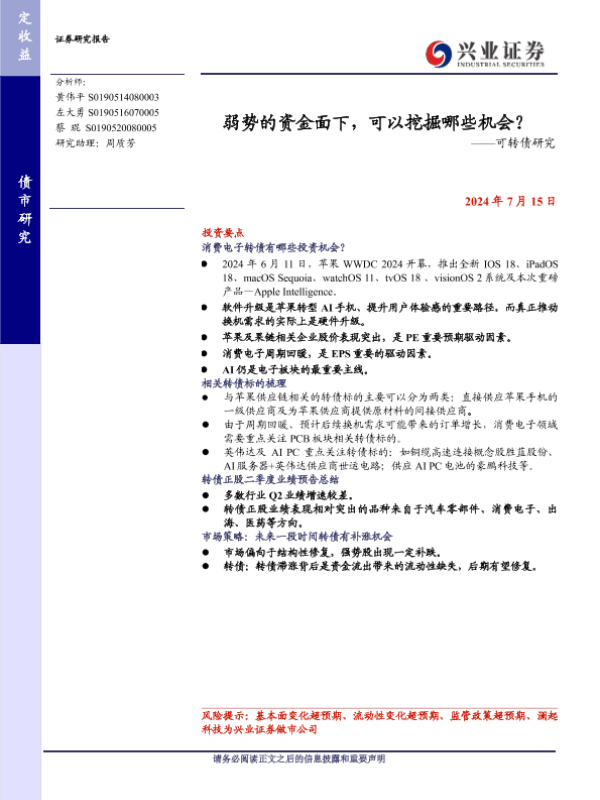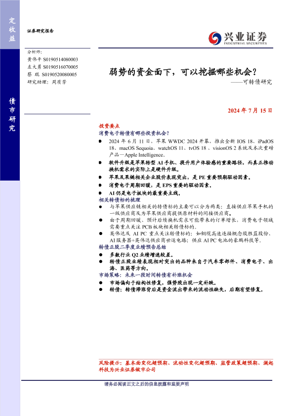 AI技术 可转债 市场策略 消费电子 苹果供应链