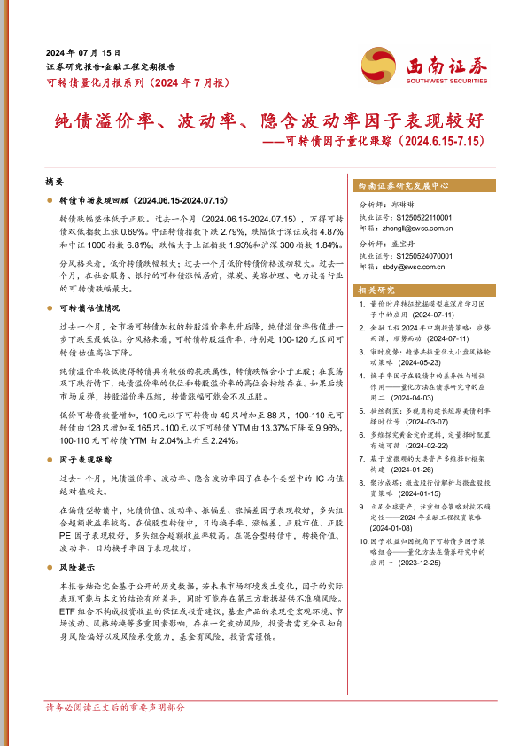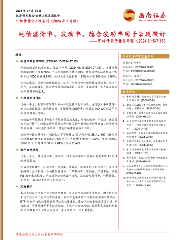 【西南证券】【20240715】可转债量化月报系列(2024年7月报):可转债因子量化跟踪,纯债溢价率、波动率、隐含波动率因子表现较好-13页