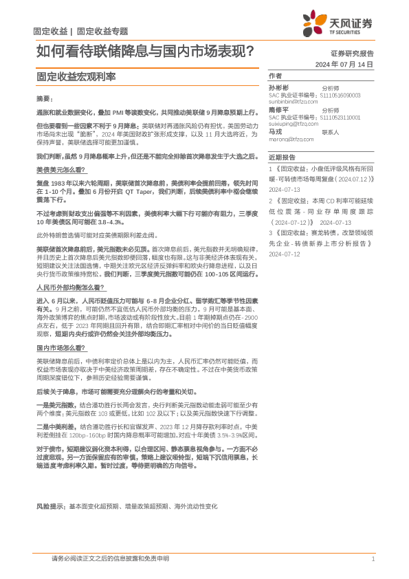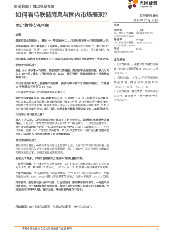 【天风证券】【20240714】固定收益宏观利率:如何看待联储降息与国内市场表现?-16页