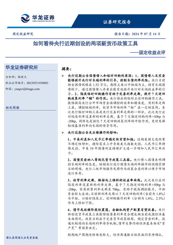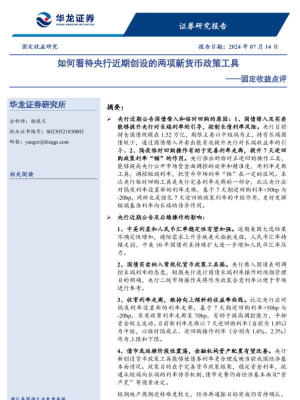 【华龙证券】【20240714】固定收益点评:如何看待央行近期创设的两项新货币政策工具-10页