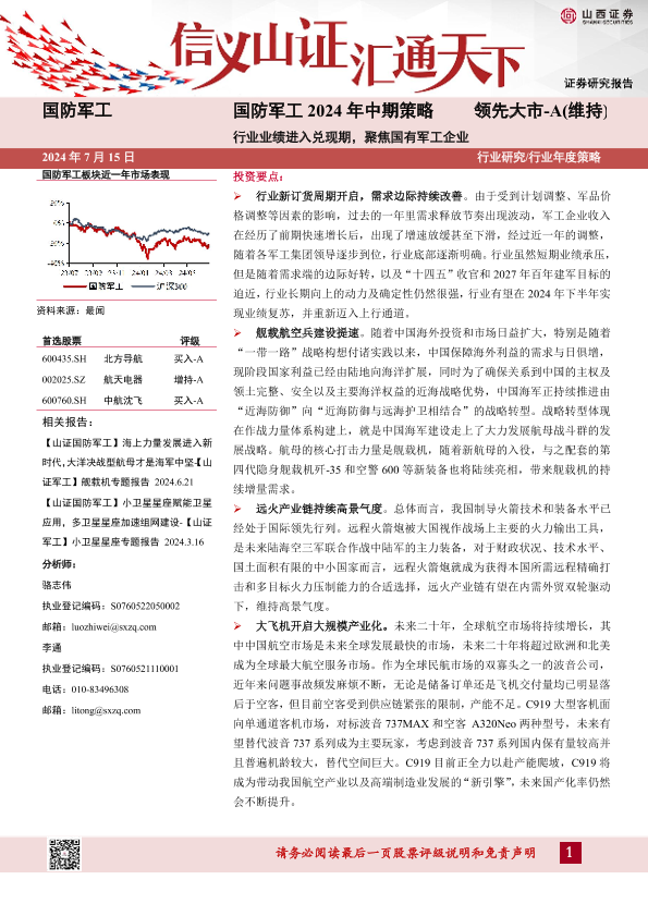 【山西证券】【20240715】国防军工行业2024年中期策略:行业业绩进入兑现期,聚焦国有军工企业-31页