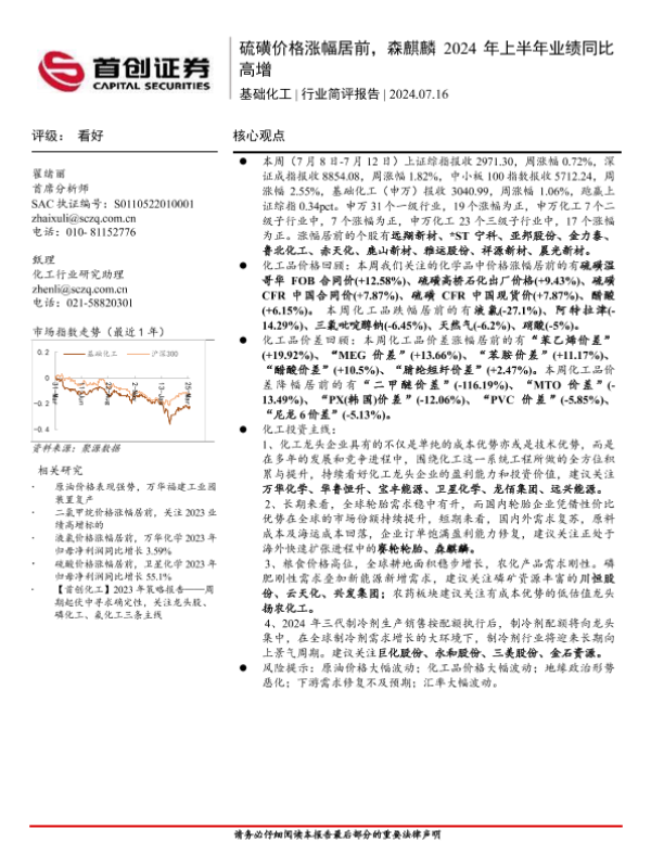 【首创证券】【20240716】基础化工行业简评报告:硫磺价格涨幅居前,森麒麟2024年上半年业绩同比高增-16页