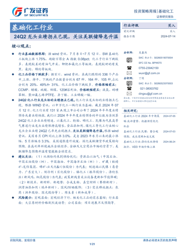 【广发证券】【20240714】基础化工行业:24Q2龙头业绩拐点已现,关注美联储降息升温-21页