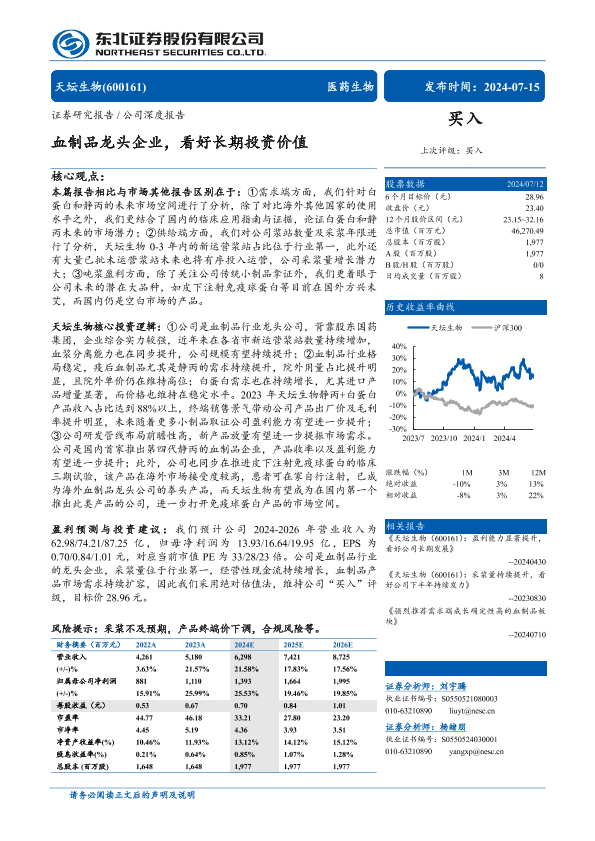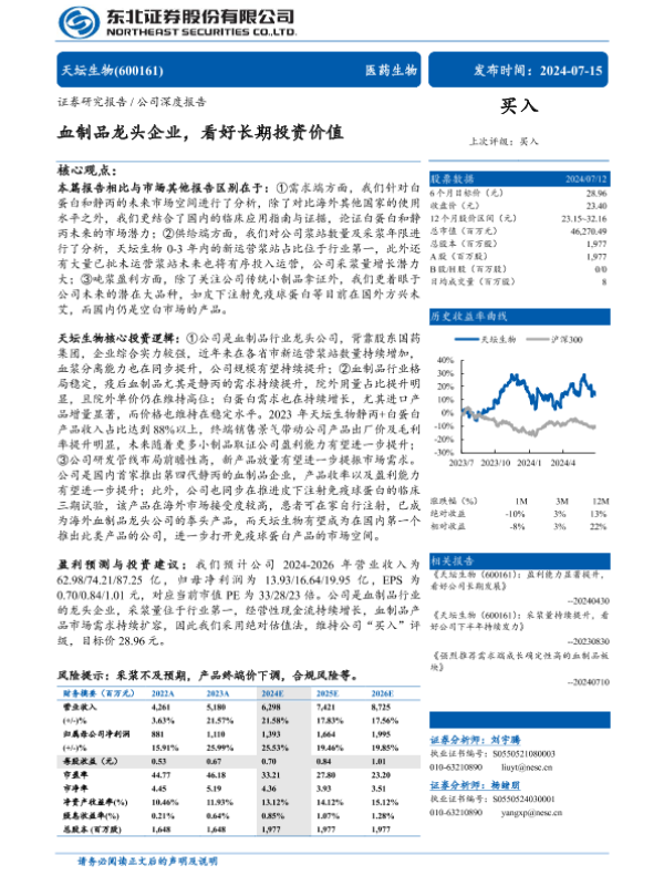 【东北证券】【20240715】天坛生物(600161)血制品龙头企业,看好长期投资价值-28页