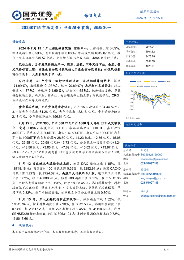 【国元证券】【20240715】20240715市场复盘:指数缩量震荡,涨跌不一-11页