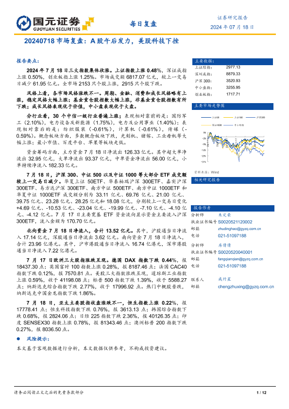 【国元证券】【20240718】市场复盘:A股午后发力,美股科技下挫-12页