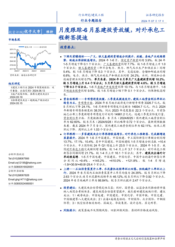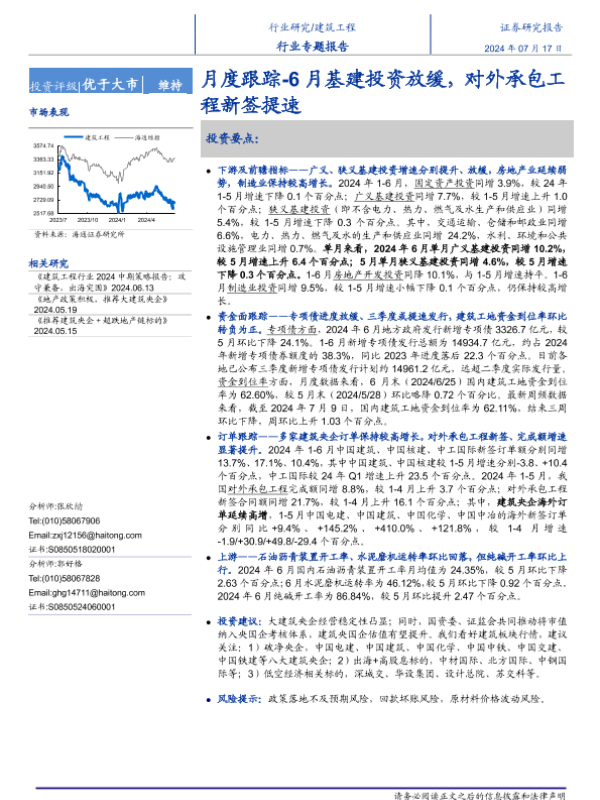 【海通证券】【20240717】建筑工程行业月度跟踪:6月基建投资放缓,对外承包工程新签提速-13页