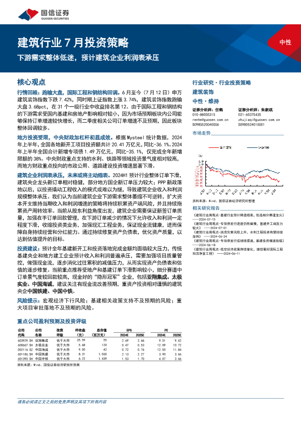 【国信证券】【20240716】建筑行业7月投资策略:下游需求整体低迷,预计建筑企业利润表承压-19页