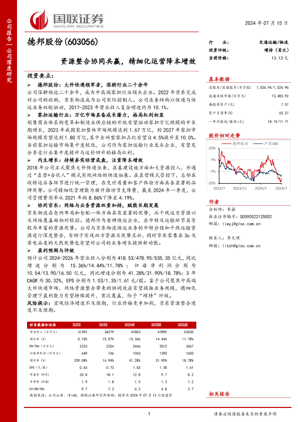 【国联证券】【20240715】德邦股份(603056)资源整合协同共赢,精细化运营降本增效-30页