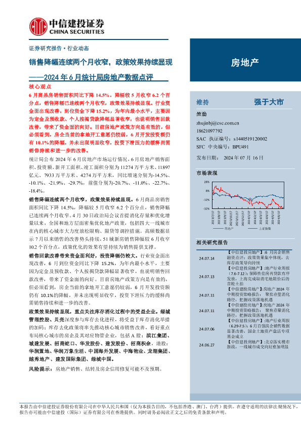 【中信建投证券】【20240716】房地产行业2024年6月统计局房地产数据点评:销售降幅连续两个月收窄,政策效果持续显现-10页