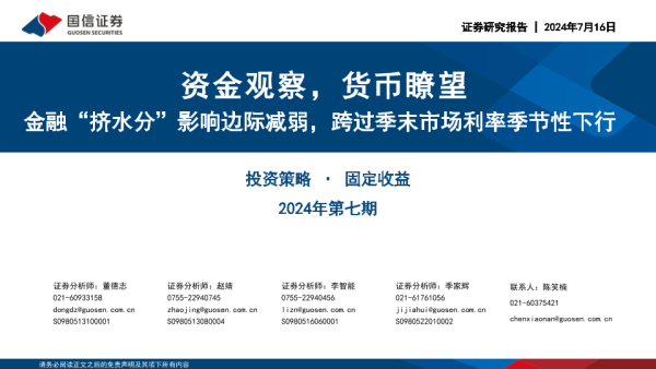 【国信证券】【20240716】投资策略·固定收益2024年第七期:资金观察,货币瞭望,金融“挤水分”影响边际减弱,跨过季末市场利率季节性下行-28页
