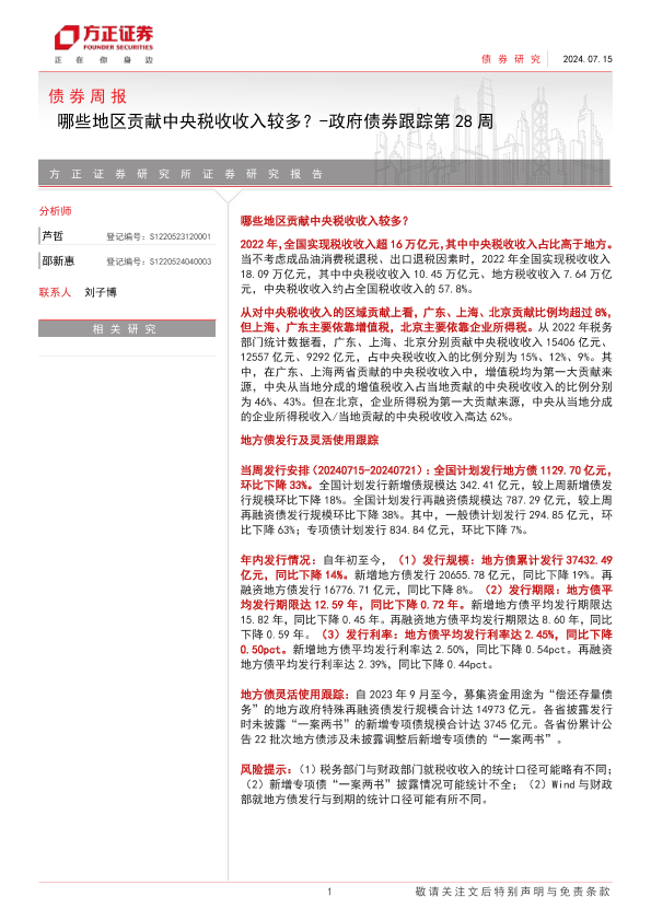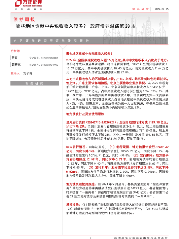 【方正证券】【20240715】政府债券跟踪:哪些地区贡献中央税收收入较多?-13页