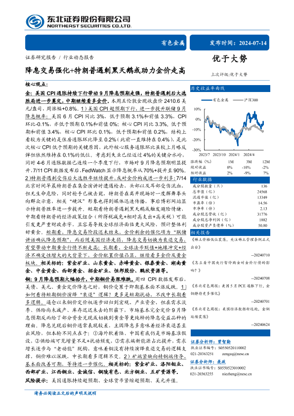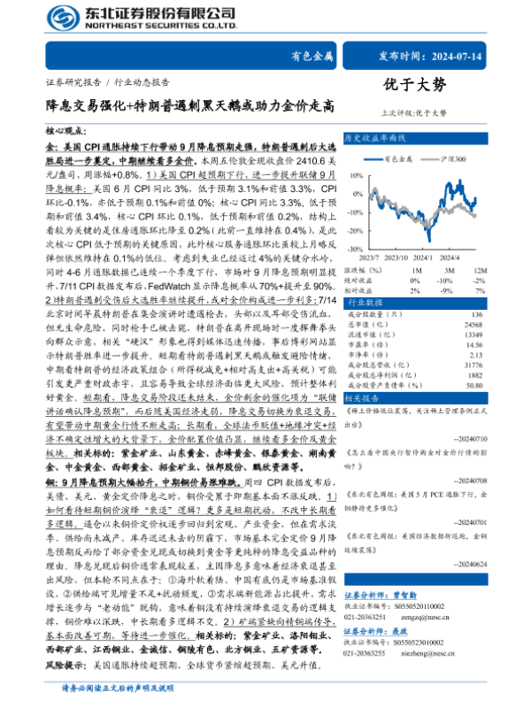 【东北证券】【20240714】有色金属行业:降息交易强化+特朗普遇刺黑天鹅或助力金价走高-28页