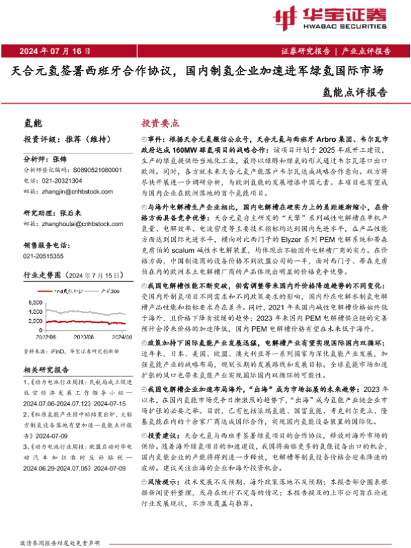 【华宝证券】【20240716】氢能行业点评报告:天合元氢签署西班牙合作协议,国内制氢企业加速进军绿氢国际市场-10页