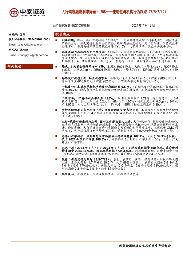 【中泰证券】【20240713】流动性与机构行为跟踪(7/8-7/12):大行隔夜融出利率降至1.70%-13页