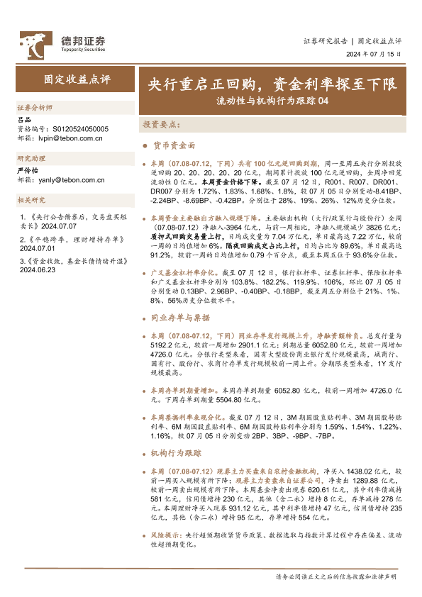 【德邦证券】【20240715】流动性与机构行为跟踪04:央行重启正回购,资金利率探至下限-18页