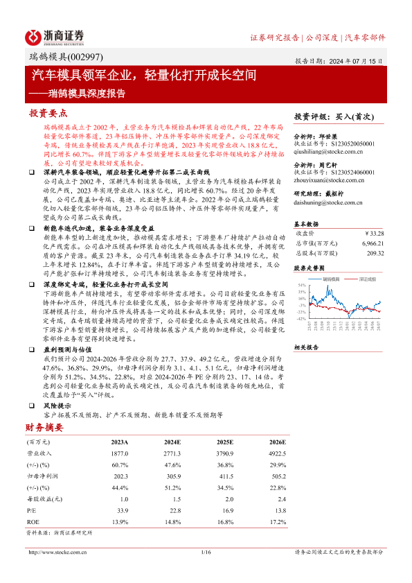 【浙商证券】【20240715】瑞鹄模具(002997)深度报告:汽车模具领军企业,轻量化打开成长空间-16页