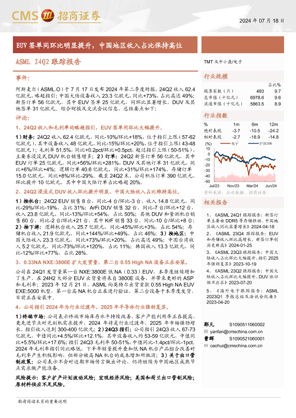 【海通证券】【20240718】电子行业ASML 24Q2跟踪报告:EUV签单同环比明显提升,中国地区收入占比保持高位-10页